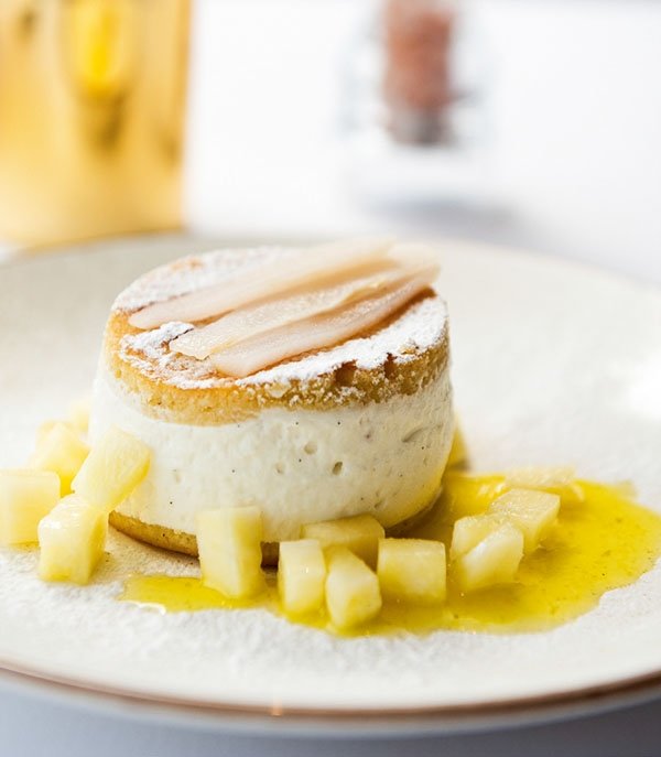 Armutlar, su, vanilya ve sekerle pisirilir. Pandispanya keki üzerinde ricotta peyniri, portakal sosu, taze ananas ve armut ile tatlımızı hazırlayıp sunarız.