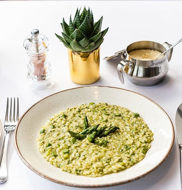Carnaroli pirinci ile hazırladıgımız risottoyu taze kuskonmaz püresi ve parmigiano peyniri ile servis ediyoruz.