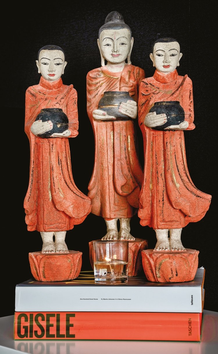 Çılgın bir Uzakdoğu merakım ve ilgim var, beni inanılmaz derecede huzurlu ve mutlu yaparken çok da etkiliyor; sabırları, detaylara verdikleri önem ve tutkularından etkilenmemek mümkün değil, tabii bunda Buddha'nın çok etkisi var. Turuncu, enerjinin ve huzurun rengi, aynı zamanda yaratıcılık ve güneşi temsil etmesi ile birçok toplumda güven olarak kullanılan ya da var olan ortamlara güç vermesi ile bilinen bir renk. Turuncuyu sadece detay olarak kullanabilirsiniz, fazlası sizi yorar ve bu kadar etkilemez. Optimist bir renk olmasının yanı sıra herkesi gülümseten içini ısıtan bir renk; ben de bu kadar siyah-beyaz bir ortamda tam da bunu yakalamak istedim. Seçtiğim objeler tapınak kase kapları ve düğünlerde kullanılan takı kapları, 3'lü Buddha setinde: 1 adet Buddha ve iki öğrencisi pirinç kabı taşıyorlar. Çok özel bir mumya Buddha var kütüphane kısmında, o Tayland Kraliçesi'nin öğretmenin birebir mumya kopyası; çok özel bir parça.